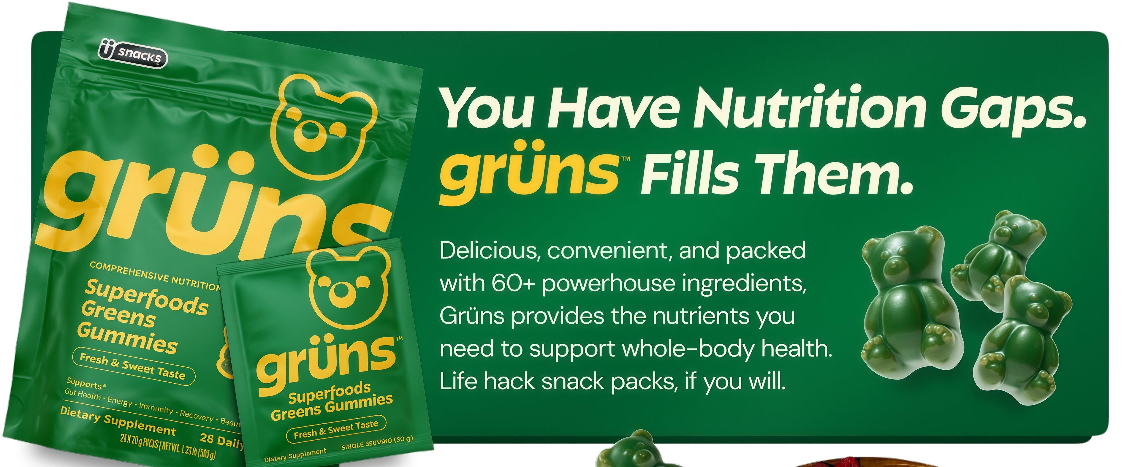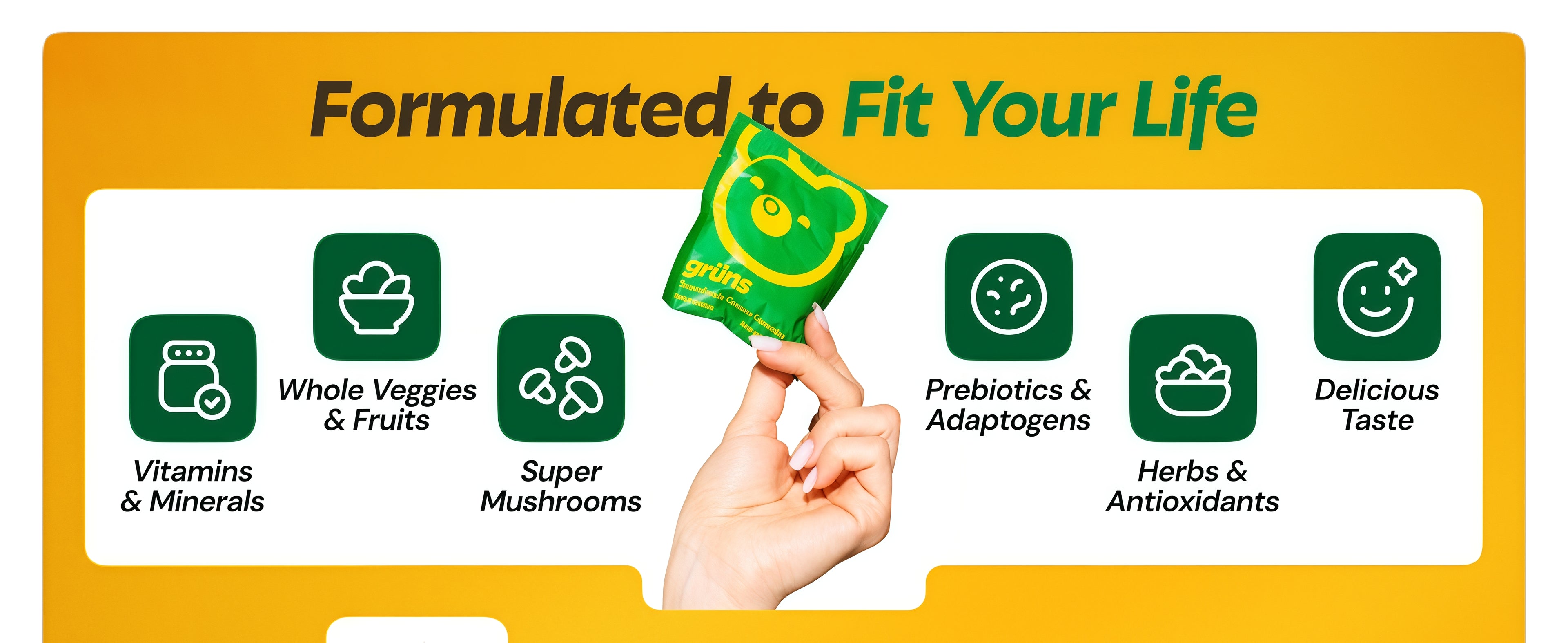 Grüns supports digestion, immune health, energy metabolism, and normal cognitive function — plus nutrients that help maintain healthy hair, skin, and nails — all in one convenient and delicious daily pack of gummies. Our hope is this tasty daily habit can replace a big shelf in your medicine cabinet.