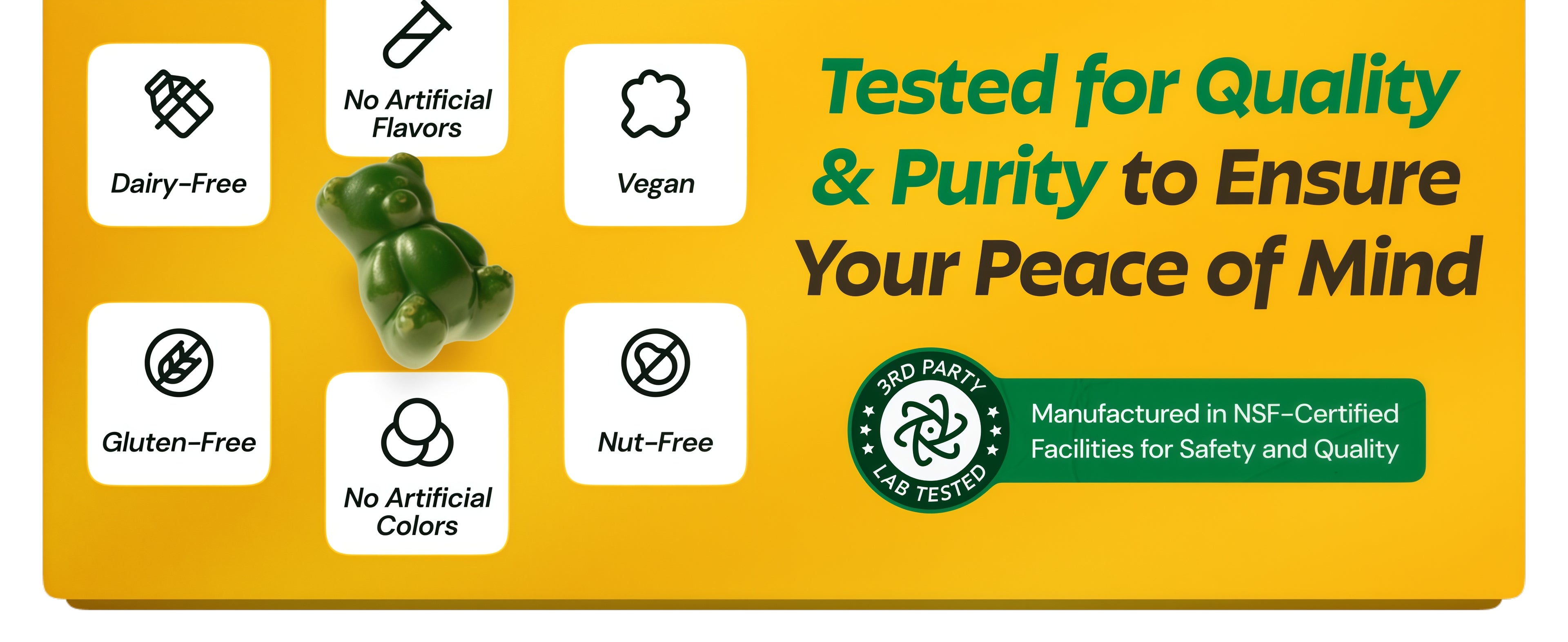 Grüns is plant-based and vegan. These gummies are free from gluten, dairy, and nuts. No synthetic sweeteners, no synthetic dyes.