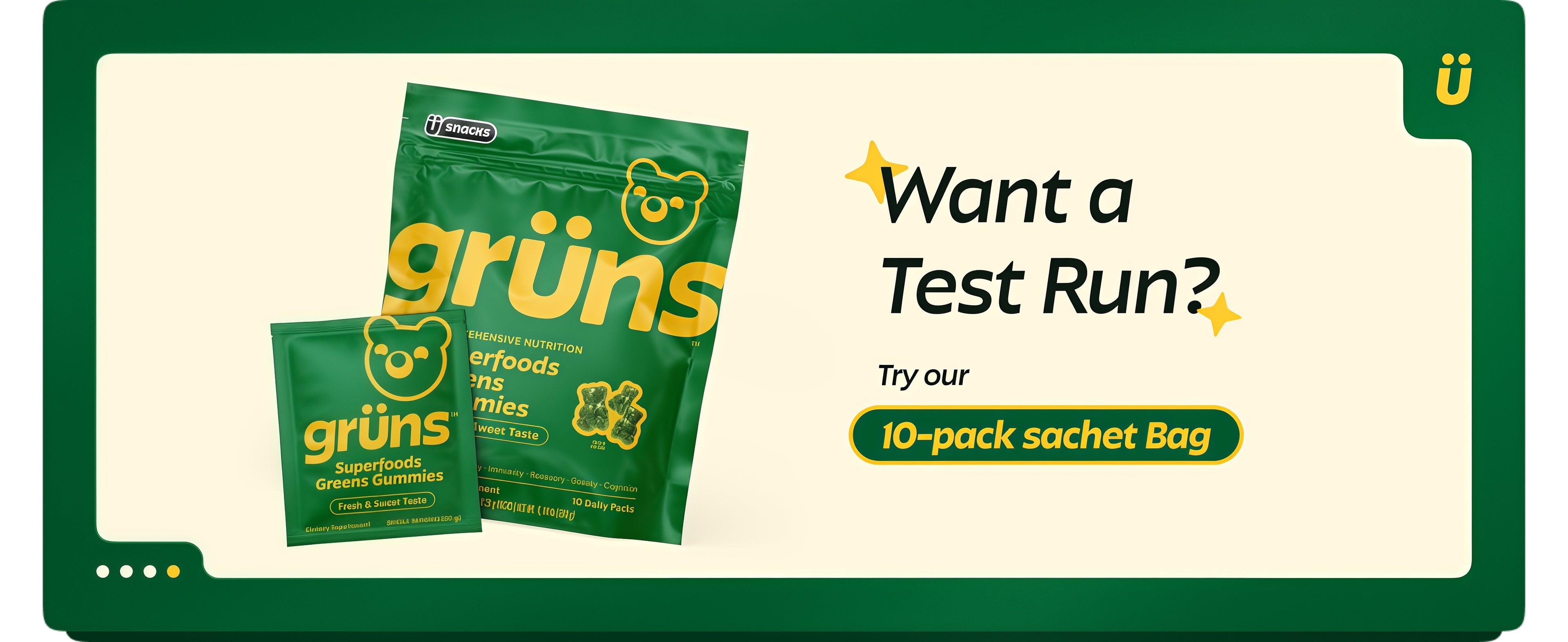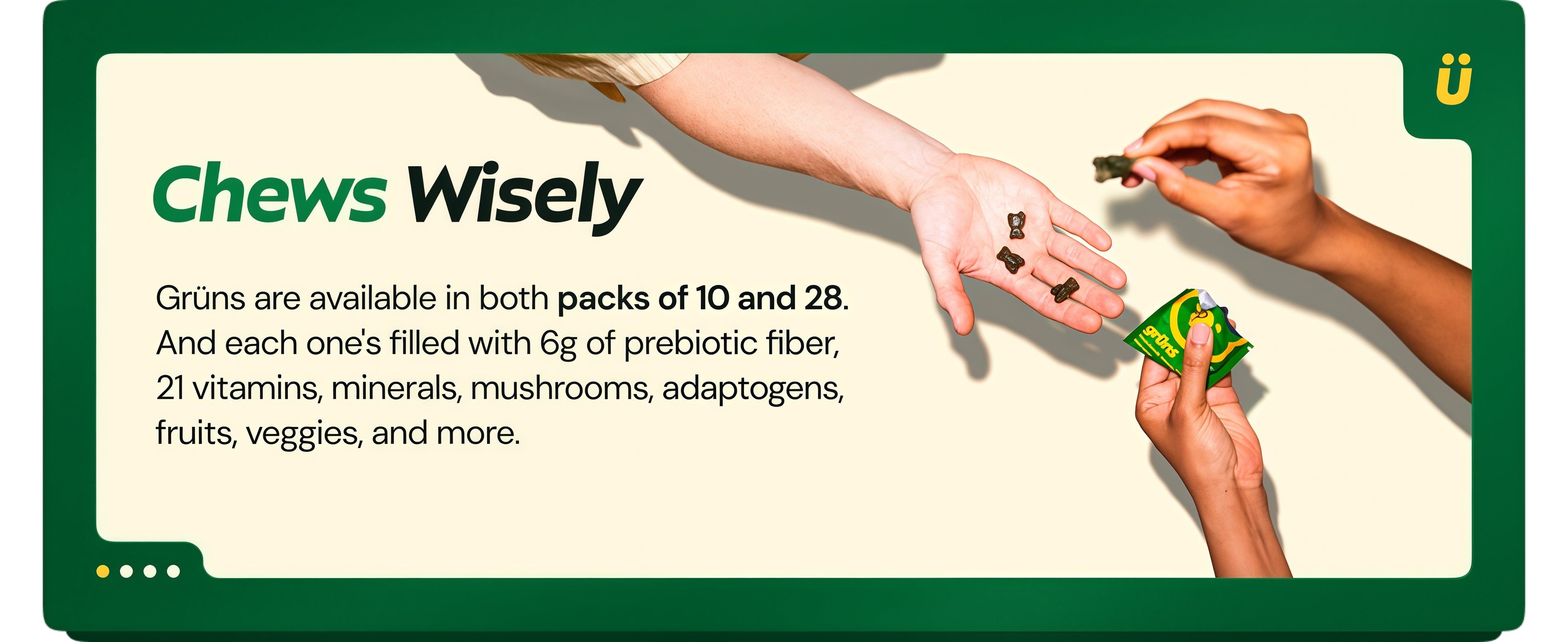 Each large pouch of Grüns contains 28 individual packs. Grab a single pack daily and enjoy the small handful of green gummy bears inside for comprehensive nutrition.