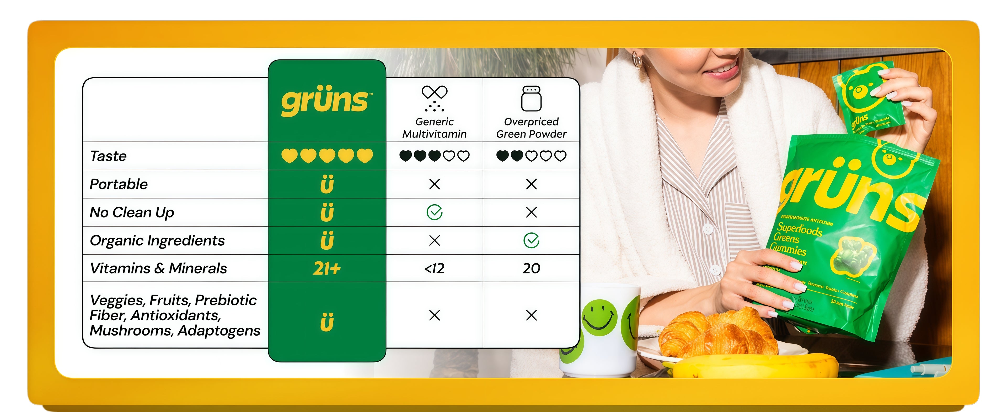 Grüns contains over 20 vitamins & minerals including Vitamin A, Vitamin B6, Vitamin B12, Vitamin C, Vitamin D3, Vitamin E, Vitamin K2, Biotin, Folate, Niacin, Pantothenic Acid, Vitamin B2, Thiamine, Chromium, Copper, Iodine, Manganese, Molybdenum, Selenium, Zinc, and Iron.